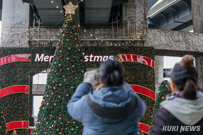 이날 서울 광진구 뚝섬한강공원 청담대교 하부에는 약 10m높이의 대형 크리스마스 트리가 설치됐다. 다리 아래 공간은 ‘메리 크리스마스(Merry Christmas)’ 문구와 조명 장식들이 주렁주렁 달렸다. 트리 앞에는 기념사진을 남기는 시민들의 발길이 이어졌다.