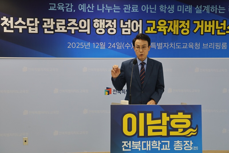 이남호 전 전북대 총장은 24일 전북특별자치도교육청 브리핑룸에서 기자회견을 열고 “교육감은 더 이상 주어진 예산을 전달하는 ‘예산 배달부’에 머물러서는 안 된다”며 “중앙부처와 지자체, 민간의 자원을 교육과 연결해 전북교육의 곳간을 채우는 ‘재정 설계자’가 필요하다”고 강조했다.