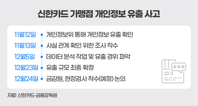 특히 이번 사안은 약 3년이 지난 뒤 공익 제보를 계기로 뒤늦게 드러났다는 점에서 논란을 키우고 있다. 개인정보위는 지난달 12일 관련 제보를 접수한 뒤 신한카드에 자료 제출을 요구했다. 신한카드는 제보자가 제출한 약 28만 건의 가맹점 정보와 내부 데이터를 대조·분석하며 자체 조사에 착수했다. 데이터베이스(DB) 비교와 관련 직원 조사 등을 거쳐 2022년 3월부터 올해 5월까지 약 3년간 정보 유출이 지속됐다는 사실을 확인했다.