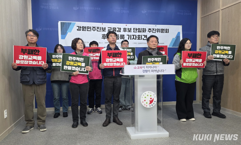 강원지역 38개 단체가 참여한 강원 민주진보 교육감 후보 단일화 추진위원회는 24일 강원특별자치도교육청에서 기자회견을 하고, 두 명이 후보 등록을 마쳤다고 밝혔다.