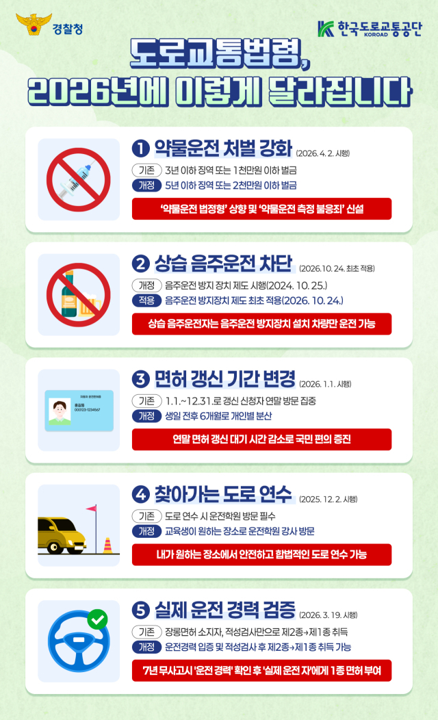 28일 경찰청이 공개한 ‘2026년 달라지는 도로교통법령’에 따르면 최근 5년 이내 음주운전을 2회 이상 한 운전자는 2년의 결격 기간이 지난 뒤 면허를 재취득하더라도 방지 장치를 설치해야 한다.