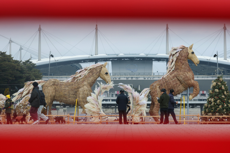 붉은 말의 해인 병오년을 앞둔 28일 서울 마포구 월드컵공원에 억새로 만든 말 ‘억새말 형제’ 조형물이 설치돼 있다. 하늘공원의 대표 부산물인 억새 4톤을 활용해 제작된 이 조형물은 멈추지 않는 도전과 전진의 정신을 상징한다.