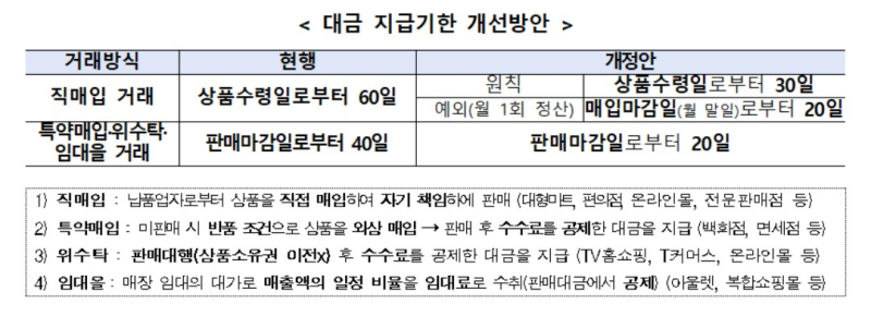 직매입 거래는 원칙적으로 상품수령일로부터 30일 이내에 상품 대금을 지급하도록 개선할 예정이다. 이는 이미 대다수의 유통업체가 30일 이내 지급하고 있고, 법상 상한에 근접하게 대금을 지연하여 지급하고 있는 유통업체들의 지급 관행(9개 업체 평균 53.2일)을 업계 평균 수준으로 대폭 개선할 필요가 있다는 점을 고려한 것이다.