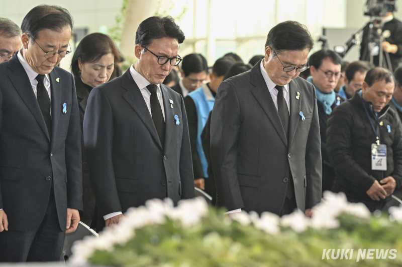 천하람 개혁신당 의원(왼쪽부터), 김병기 더불어민주당 원내대표, 정청래 더불어민주당 대표, 우원식 국회의장, 장동혁 국민의힘 대표가 29일 오전 전남 무안군 무안국제공항에서 열린 '12.29 제주항공 여객기 참사 1주기 추모식'에 참석해 희생자들을 기리며 헌화하고 있다.