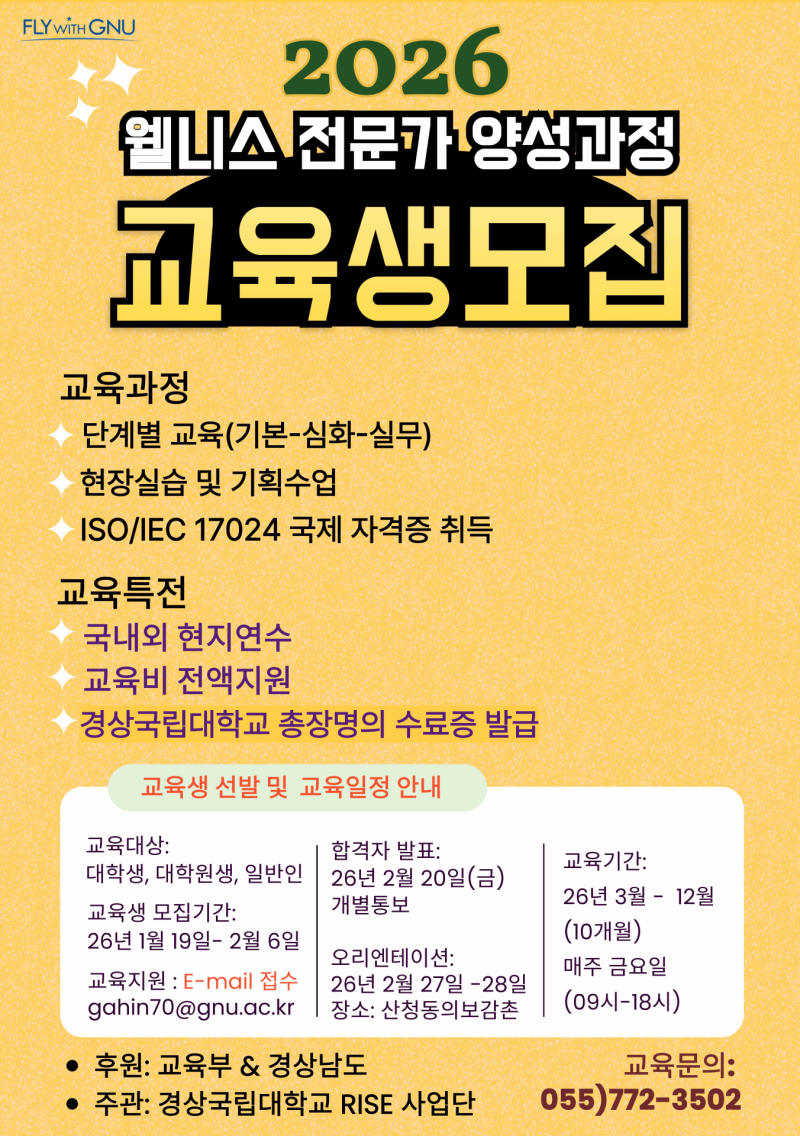 모집 대상은 경상국립대 소속 학부생·대학원생과 일반인이며, 접수 기간은 2026년 1월 19일부터 2월 6일까지다. 교육은 2026년 3월부터 12월까지 매주 금요일 운영되며, 총 192시간의 정규 교육과 국내외 연수, 현장실습 등이 포함된다.