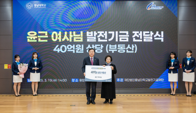 충남대에는 지난 3월, 전국적인 관심을 모았던 윤근 선생의 40억 원 상당 부동산 기부, 지명실 여사 3억 원 유언 공증 등 독지가들의 기부가 이어진 것을 비롯해 NI 32억 원, 직스테크놀로지 7억 5천만 원, 계룡건설 2억 4천만 원, 골프존 2억 원 등 기부가 줄을 이었다.