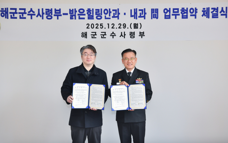 군수사는 29일 진해 공관에서 안상민(소장) 해군군수사령관과 김창현 밝은힐링안과·내과의원 대표원장이 참석한 가운데 ‘장병 의료복지 증진 및 안보 공감대 확산을 위한 업무협약(MOU)'를 체결했다.