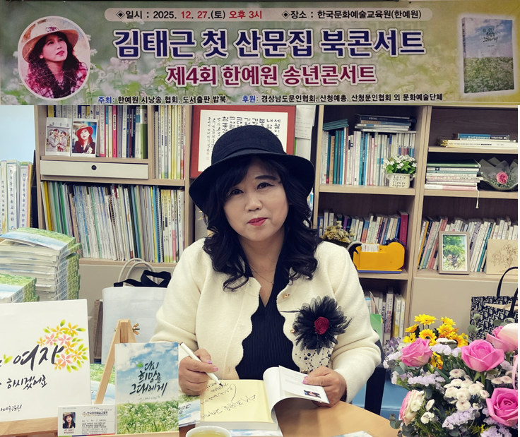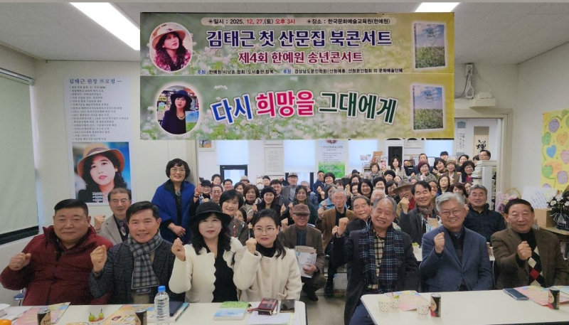 2025년 12월 27일 오후 3시, 산청 한국문화예술교육원에서 김태근 작가의 첫 산문집 <다시 희망을 그대에게> 출간을 기념하는 북콘서트와 제4회 한예원 송년콘서트가 함께 열렸다.