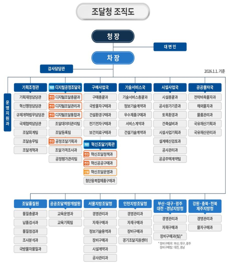 조달청이 공공조달을 통해 혁신기업의 성장을 지원하고, 공지능(AI) 등 디지털 기반 조달행정 강화를 위해 2026년 1월 1일부로 조직개편을 단행한다.