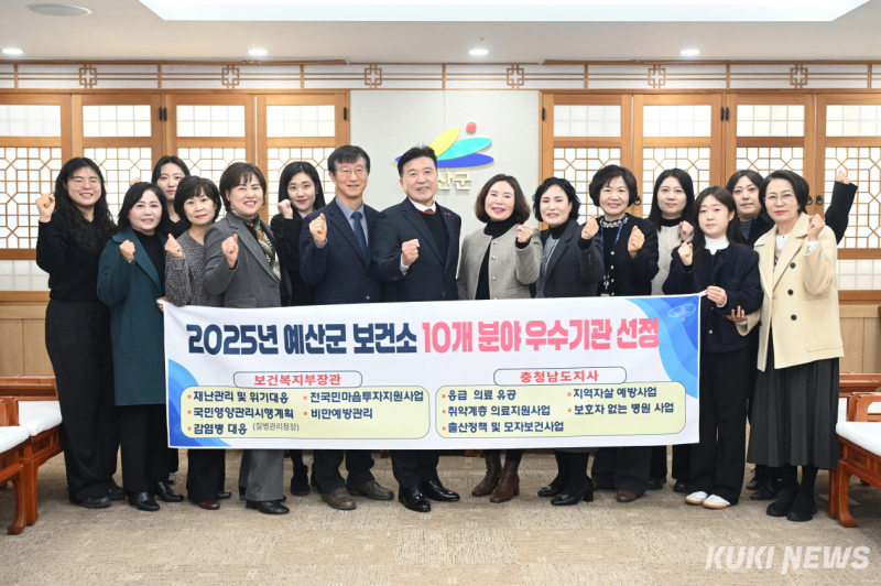 예산군보건소 10개 분야 우수기관 선정 기념 촬영 모습. 예산군은 예산군보건소가 2025년 보건 분야 중앙부처와 충남도 주관 각종 평가에서 10개 분야 우수기관으로 선정되며, 군 단위 지자체 가운데 유일하게 전국 최고 수준의 보건행정 역량을 공식적으로 인정받았다고 30일 밝혔다.
