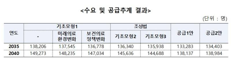 2040년에는 의사 수요가 14만4688명에서 14만9273명으로 늘어나는 반면, 공급은 13만8137명에서 13만8984명에 그쳐 의사 부족 규모가 5704명에서 최대 1만1136명까지 확대될 수 있다는 전망도 나왔다.