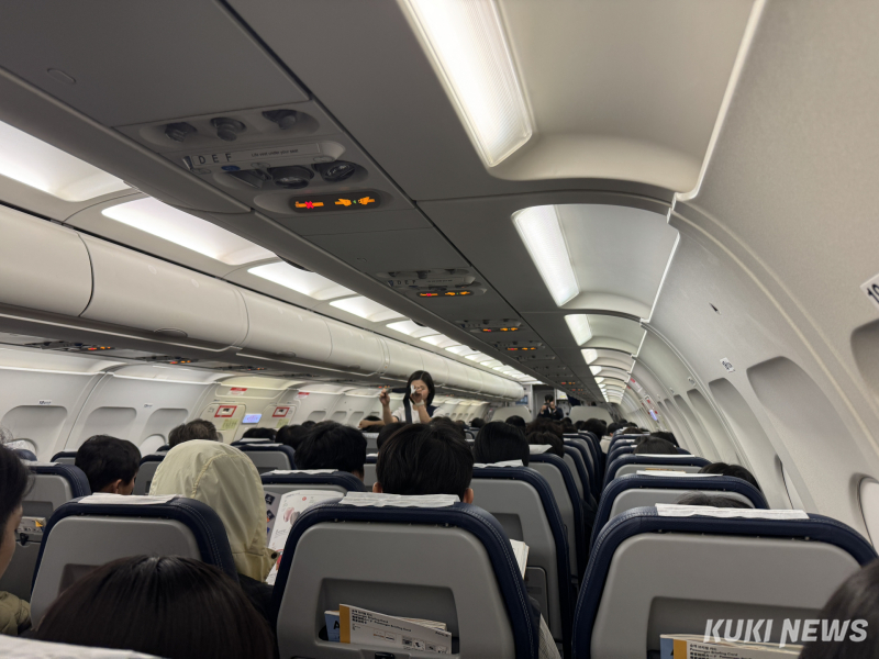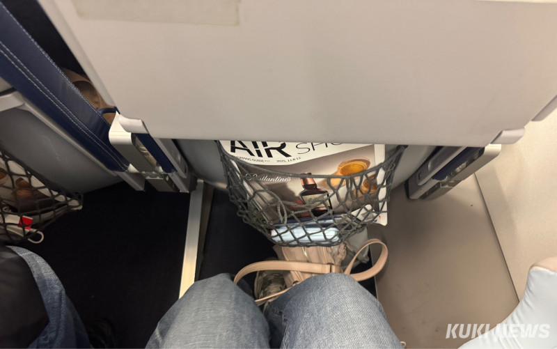 기자가 탑승한 RF523편 좌석에 앉아보니 LCC 기준에서는 비교적 여유 있는 공간이 느껴졌다. 성인이 앉았을 때 무릎과 앞좌석 사이 간격에 여유가 있었고, 약 4시간30분의 비행 시간을 감안하면 큰 불편은 없었다. 기내는 전반적으로 깔끔하게 정돈돼 있었고, 이륙과 착륙 과정도 안정적이었다.