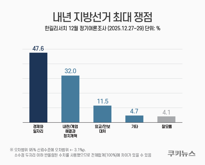 다만 유권자들의 이번 선거에 대한 인식이 민주당의 선거 프레임과 반드시 일치하지는 않는 것으로 나타났다. 쿠키뉴스가 여론조사 전문기관 한길리서치에 의뢰해 지난 27일부터 29일까지 전국에 거주하는 만 18세 이상 남녀 1023명을 대상으로 ‘내년 지방선거 최대 쟁점’을 조사한 결과 ‘경제·일자리’를 꼽은 응답이 47.6%로 가장 많았다. ‘내란·계엄 해결’은 32.0% 수준이었다.