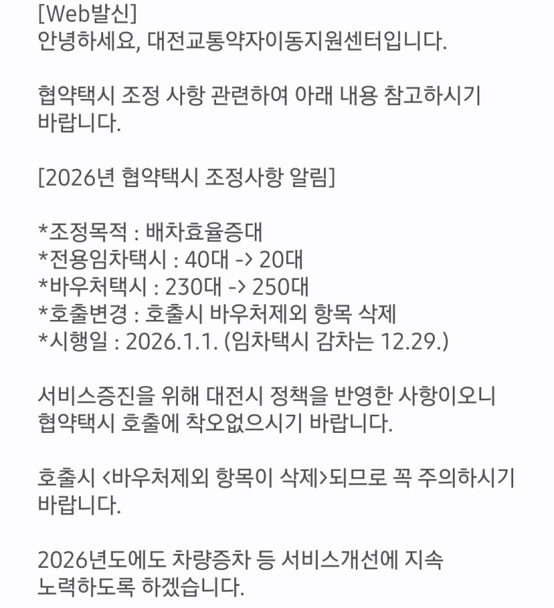 그럼에도 대전시는 지난해 12월 교통약자에게 보낸 문자에서 전용 임차택시를 줄인 목적에 대해 "배차 효율 증대"와 "서비스 증진을 위해 대전시 정책을 반영한 사항"이라고 말해 문자를 받은 시민을 분노케 했다.