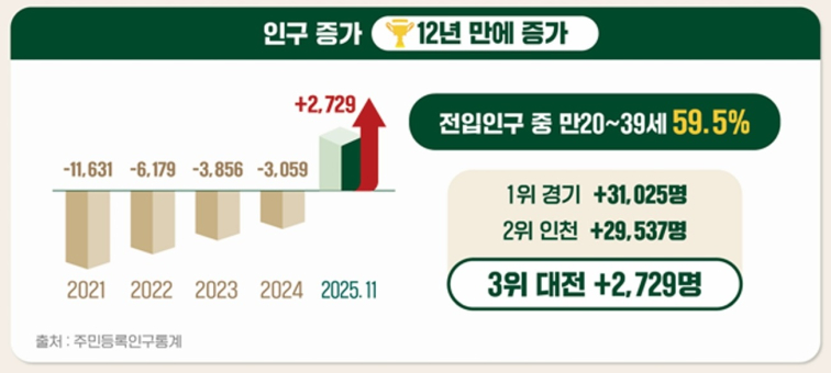 이장우 대전시장은 “12년 만의 인구 증가세 전환은 단순한 수치 변화를 넘어 대전의 미래세대가 꿈을 펼칠 수 있는 기반이 마련되었음을 의미한다”며, "2026년도에도 청년이 머물기 좋은 양질의 일자리 창출, 안정적인 주거 환경, 교육과 돌봄이 유기적으로 연결된 지속 가능한 산업 기반 인구 정책을 통해 도시 매력도를 높여가겠다"고 계획을 밝혔다. 아울러 이 시장은 “대전은 대한민국에서 가장 역동적이고 성장하는 도시로 확실하게 변화할 것”이라고 강조했다.