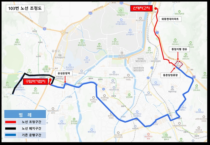 2월 12일부터 조정되는 103번 시내버스 노선. 대전시