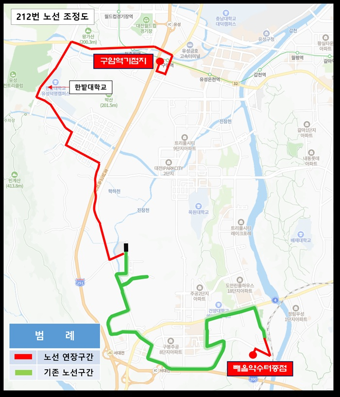 2월 12일부터 조정되는 212번 시내버스 노선. 대전시