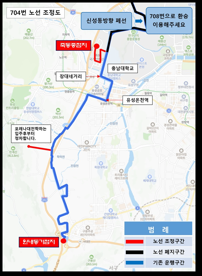 2월 12일부터 조정되는 704번 시내버스 노선. 대전시