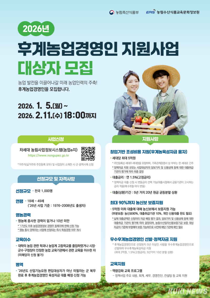 후계농업경영인 지원사업 알림그림. 충남도는 5일 ‘2026년 후계농업경영인 지원사업’ 모집을 시작했다.