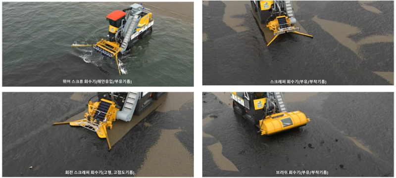 이에 KRISO 최혁진 책임연구원은 수심 1m 환경과 모래·자갈 등 연약 지반에서도 이동과 작업이 가능한 수륙양용 궤도차량과, 유출 기름의 상태 및 현장 조건에 따라 선택적으로 적용할 수 있는 회수장치 4종을 개발했다.
