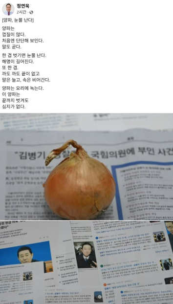 정 의원은 5일 자신의 페이스북에 김 의원의 공천헌그 의혹을 양파에 빗대 "한 겹 벗기면 눈물 난다. 해명이 길어진다. 또 한 겹.. 까도 까도 끝이 없고 말은 늘고 속은 비어간다. 까도 까도 끝이 없는 양파 같다"고 꼬집었다.