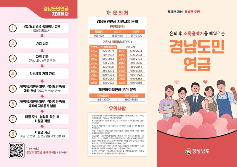 경남도민연금 지원사업은 개인형퇴직연금(IRP)을 활용한 노후 대비 제도로, 가입자가 납입한 금액에 따라 경상남도와 시·군이 지원금을 적립해 주는 방식이다. 연간 납입액 8만원 당 2만원을 지원하며 1인당 연 최대 24만원, 최대 10년간 총 240만원까지 지원받을 수 있다.