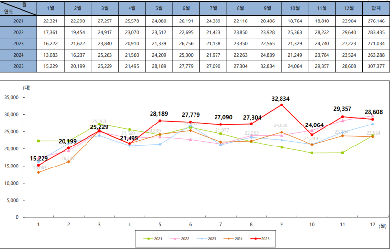 12월 실적 집계가 마무리되며 2025년 연간 수입 승용차 신규 등록 대수가 확정됐다. 연간 누적 등록 대수는 30만7377대로, 전년(26만3288대) 대비 16.7% 증가했다.