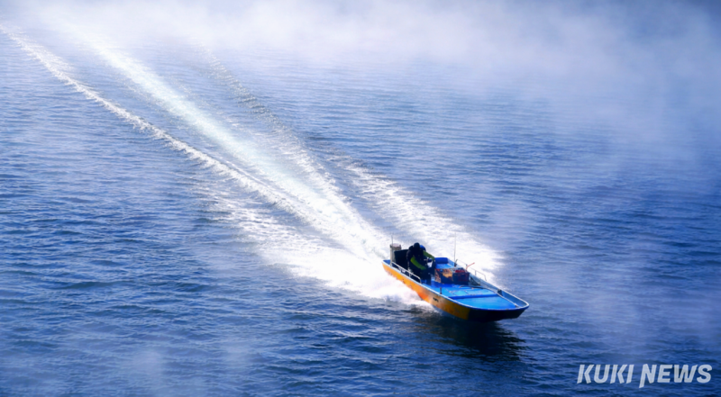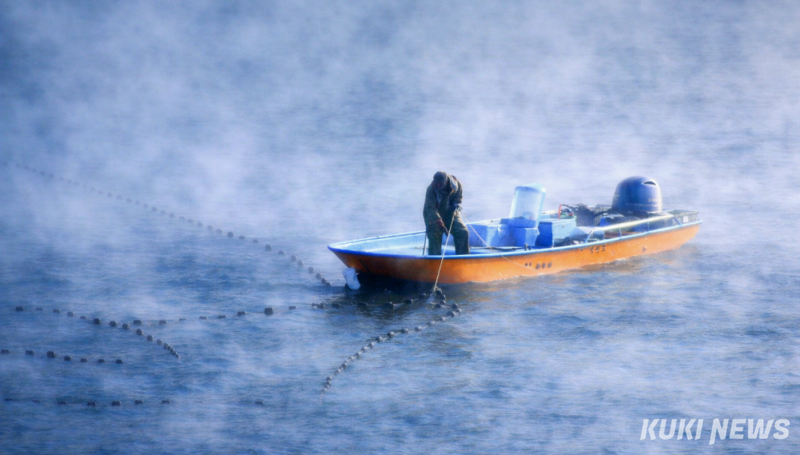 6일 오전 강원 인제군 소양호 일대에서 한 어부가 피어오른 물안개를 헤치며 버들털기 조업을 하고 있다. 버들털기는 과거 인제지역의 어부들이 행했던 전통 고기잡이다.(인제군 제공)