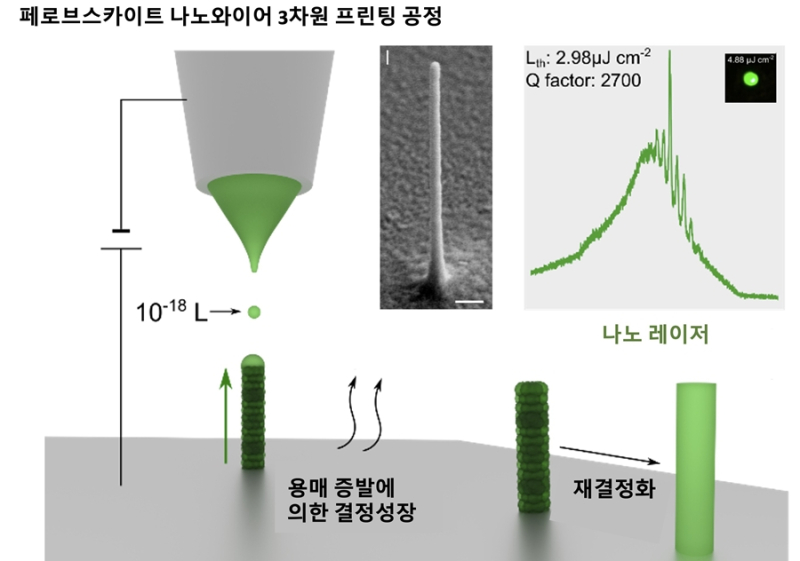 KAIST 기계공학과 김지태 교수팀은 포스텍 노준석 교수팀과 공동연구로 초고밀도 광집적회로의 핵심 소자인 ‘수직형 나노레이저’를 만들 수 있는 초미세 3차원 프린팅 기술을 개발했다고 6일 밝혔다.