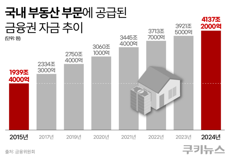 금융당국·한국은행 등에 따르면, 우리나라 가계 자산 64%는 부동산에 몰려있다. 경제협력개발기구(OECD) 평균(52.9%)을 크게 웃도는 수준이다. 부동산 부문에 공급된 금융권 자금은 약 4137조원에 달한다. 경제성장률(GDP) 대비 비중은 지난 2015년 111%에서 지난 2024년 말 162%로 급증했다.