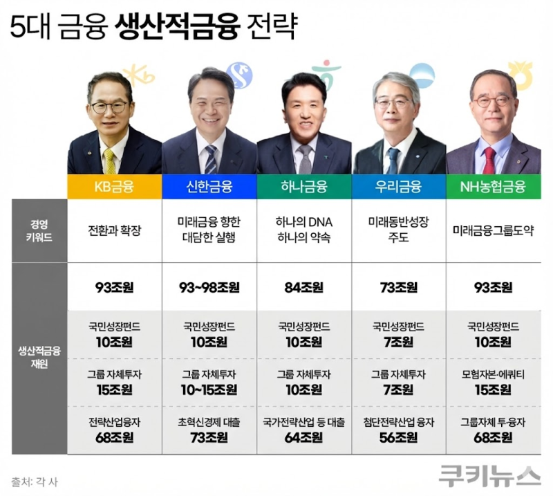5대 금융지주는 이를 위해 전사적 조직 개편에 나섰다. KB금융은 ‘기업투자금융(CIB) 마켓부문’을 신설해 그룹 차원의 전략을 총괄하는 컨트롤 타워를 구축했다. 신한금융은 진옥동 회장이 위원장을 맡는 ‘그룹 생산적 금융 추진단’을 발족했다. 우리금융은 투자은행(IB) 그룹과 기업그룹에 각각 투·융자 전담 조직을 신설했다. 하나금융은 기존 CIB본부를 ‘투자·생산적금융부문’으로 재편하고, 산하에 ‘생산적금융지원팀’을 새로 만들었다. NH농협금융 역시 중소기업고객부를 기업성장지원부로 재편하고 생산적금융국을 설치하기로 했다.