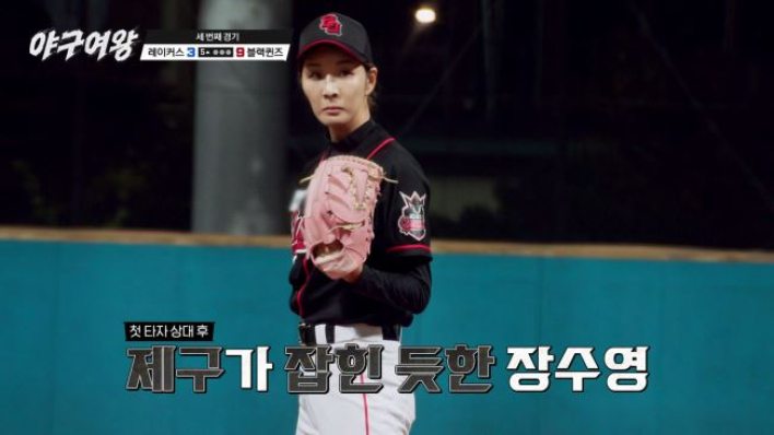 레이커스와 맞붙은 블랙퀸즈는 3회 말까지 8:3으로 리드를 지켰고, 이에 4회 초에도 ‘선발 투수’ 장수영이 마운드에 올랐다. 장수영은 연속 스트라이크와 삼진을 잡아내며 투아웃을 만들었다. 이후 레이커스의 ‘행운의 안타’와 수비 실책으로 만루 위기를 맞았지만, 내야에 높이 뜬 공을 포수 신소정이 침착하게 처리하며 공수 교대에 성공했다. 4회 말 블랙퀸즈의 공격에서는 지명 타자 이수연이 시원한 2루타에 이어 3루 도루까지 성공시키는 환상의 주루 플레이를 선보였으며, 김민지의 내야 안타로 홈을 밟으며 1점을 추가했다.