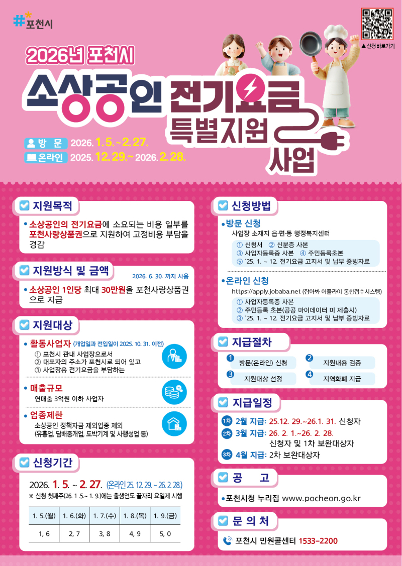 '포천시 소상공인 전기요금 특별지원 사업'은 소상공인이 부담한 전기요금 일부를 포천사랑상품권으로 지원해 고정비 부담을 경감하는 사업이다. 2025년 10월 31일 이전 개업한 포천시 관내 사업장 가운데 같은 날짜 이전부터 대표자 주소가 포천시로 되어 있고 사업장용 전기요금을 부담하는 연매출 3억원 이하의 소상공인이 대상이다.