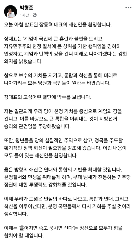 박 시장은 이날 자신의 SNS에 "장 대표는 '계엄이 국민께 큰 혼란과 불편을 드리고 자유민주주의 헌정 질서에 큰 상처를 가한 행위임을 겸허히 인정하고 계엄과 탄핵의 강을 건너 미래로 나아가겠다'는 강한 의지를 밝혔다"고 글을 올렸다.