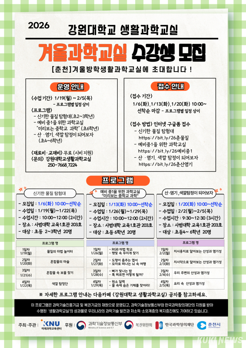 춘천은 19일부터 2월 5일까지 강원대학교 사범대학 교육1호관에서 운영되고, 원주는 20일부터 2월 6일까지 국립강원전문과학관 소강당에서 진행된다.