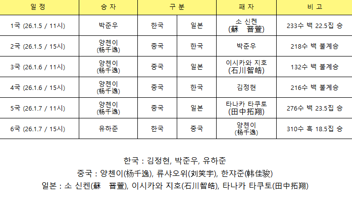 한편 한국팀 유하준 선수는 조훈현 9단 이후 63년 만에 국내 최연소 프로 입단 기록을 경신한 선수로, 이번 대회에서 가장 주목받는 유망주로 손꼽히기도 했다. 첫 경기에서 기분 좋은 승전보를 전한 유하준 1단의 활약 여부에 관심이 집중된다.