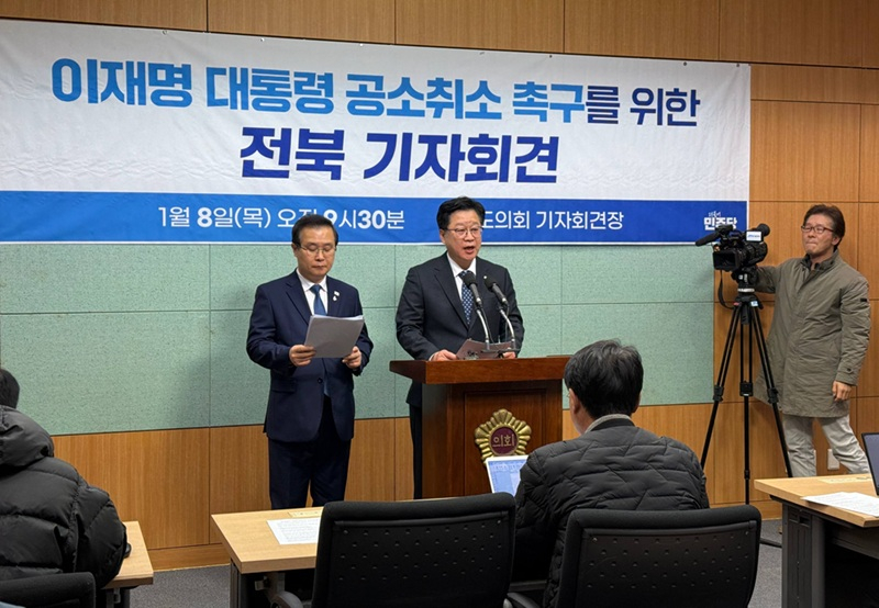 안호영·윤준병·한병도 의원과 이건태 최고위원 후보는 8일 전북특별자치도의회에서 기자회견을 통해 “이재명 대통령 사건은 내란 정권 시절 정치보복으로 만들어진 조작기소”라며 “재판 중지로는 문제를 해결할 수 없으며, 지금 당장 공소취소가 이뤄져야 한다”고 밝혔다.