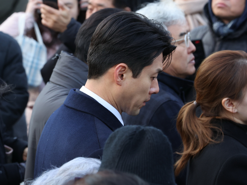 9일 서울 중구 명동성당에서 열린 배우 안성기의 장례 미사가 끝난 뒤 가족과 동료 배우들, 시민들이 고인을 배웅하고 있다. 9일 서울 중구 명동성당에서 열린 배우 안성기의 장례 미사에 참석한 배우 현빈이 고인을 배웅하고 있다.