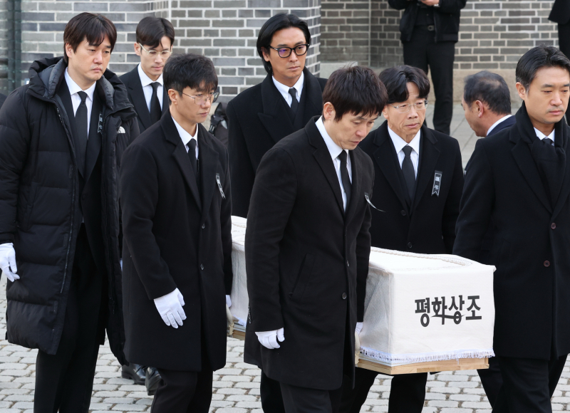 9일 서울 중구 명동성당에서 열린 배우 안성기의 장례 미사가 끝난 뒤 영결식을 위해 고인의 영정과 금관문화훈장을 든 배우 정우성, 이정재가 영결식장으로 향하고 있다.