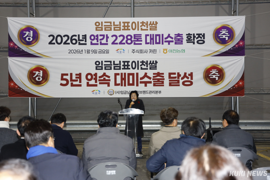 시는 이날 역대 최대 규모의 수출 계약 첫 출하를 기념해 이천농협 미곡종합처리장에서 ‘2026년 임금님표이천쌀 수출 기념식’을 가졌다.
