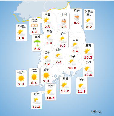 기온도 큰 폭으로 떨어진다. 11일 아침 최저기온은 -5℃ 안팎, 낮 최고기온도 0℃ 안팎에 머물 것으로 보이며, 12일 아침에는 -10℃ 안팎까지 떨어져 강추위가 이어질 전망이다. 여기에 강한 바람까지 더해져 체감온도는 더욱 낮아질 것으로 예상된다.