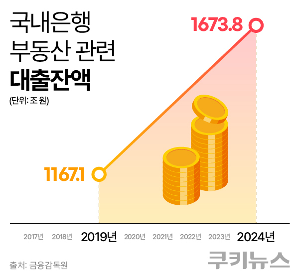 한국 금융의 생산적 기능을 약화시키는 주범은 부동산이다. 지난 1999년 외환위기 당시 대기업 연쇄 부도를 겪은 은행권은 20여년간 ‘안전한 먹거리’인 부동산 담보 영업에 몰두해왔다. 금융감독원에 따르면 2024년 말 국내 은행들의 부동산 관련 대출 잔액은 1673조8000억원에 달했다. 2019년과 비교하면 506조7000억원(43.4%) 늘었다. 연평균 증가율은 7.5%로, 전체 원화대출(7%)과 명목 GDP(4.6%)보다 가팔랐다. 부동산 관련 대출이 명목 GDP에서 차지하는 비중은 2019년 57.2%에서 2024년 65.7%로 8.5%p 확대됐다.