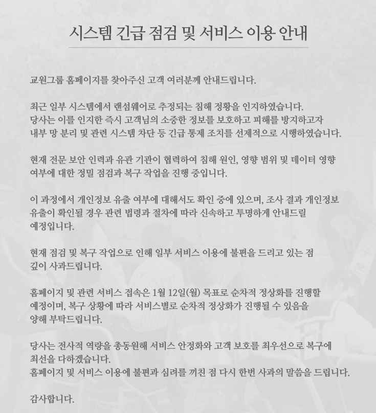 교원그룹은 홈페이지 공지문을 통해 “개인정보 유출이 확인될 경우 관련 법령과 절차에 따라 신속하고 투명하게 안내할 예정”이라며 “당사는 전사적 역량을 총동원해 서비스 안정화와 고객 보호를 최우선으로 복구에 최선을 다하겠다”라고 전했다.