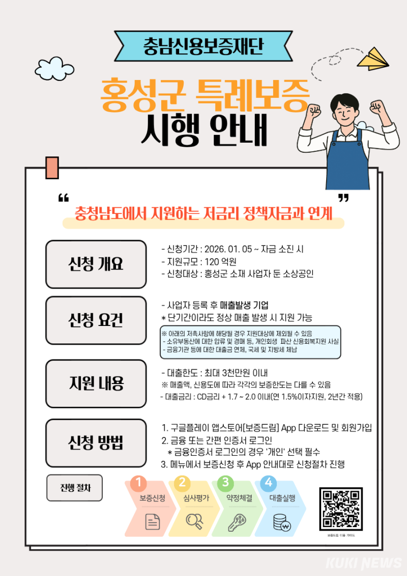 신청 대상은 홍성군에 사업장을 두고 영업 중인 소상공인이며, 업체당 보증 한도는 최대 3천만 원 이내이다. 상환 방식은 ▲2년 거치 일시상환 ▲2년 거치 3년 균분상환 ▲2년 거치 5년 균분상환 중 선택할 수 있다.