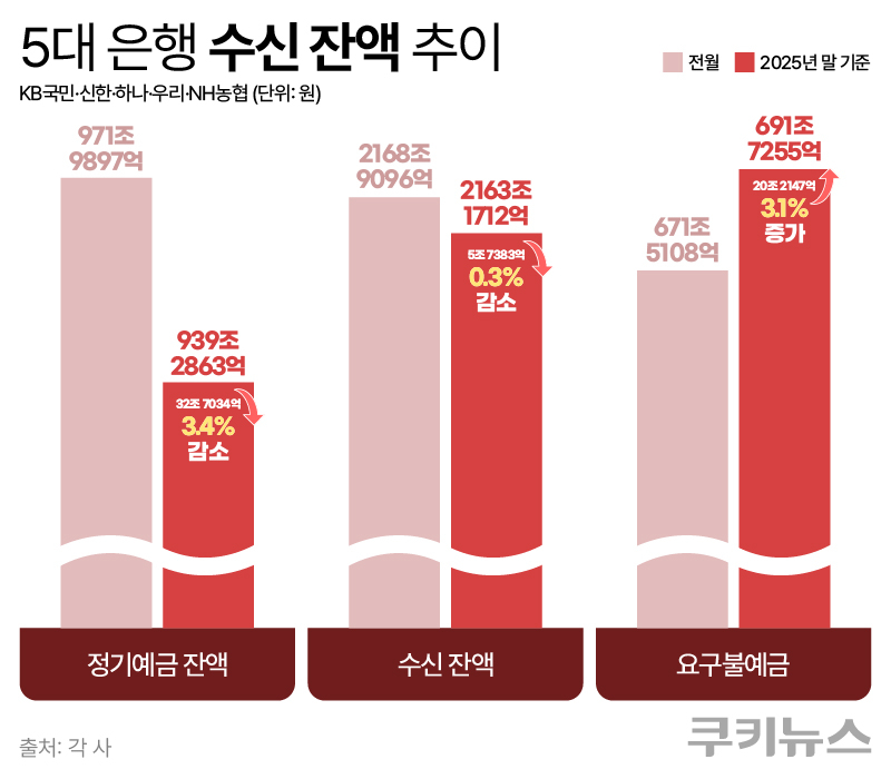 반면 은행권은 ‘예금 썰물’을 겪고 있다. 5대 은행(KB국민·신한·하나·우리·NH농협)의 지난해 말 정기예금 잔액은 939조2863억원으로 전월 대비 32조7035억원(3.4%) 급감했다. 지난해 10월~11월 20조원 넘게 유입됐던 자금이 연말 만기 시점을 맞아 증시와 가상자산 등 등으로 대거 이동한 것으로 풀이된다. 총수신 잔액도 지난달 말 기준 2163조1712억원으로 집계됐다. 전월 말 2168조9095억원 대비 한 달간 5조7383억원 감소한 규모다.