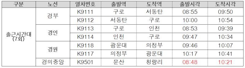 임시 전동열차는 경부·경인·경원·경의중앙 4개 노선에서 출근시간대 7회 운행할 예정이다.