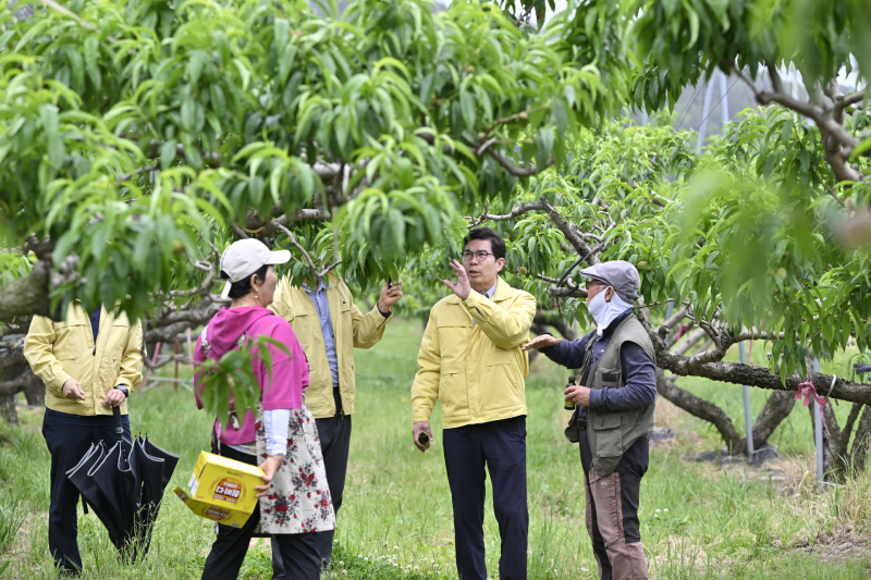 김광열 군수가 과수농가를 찾아 농민들과 이야기를 나누고 있다. 영덕군 제공