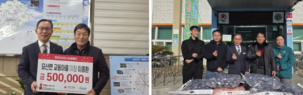 묘산면에서도 잇따라 나눔이 이어졌다. 관기리 문홍권 이장은 13일 묘산면사무소에 이불 50개를 기탁하며 “추운 겨울 어려운 이웃들에게 따뜻한 온기를 전하고 싶다”고 말했다. 같은 날 교동마을 이종환 이장도 성금 50만원을 기탁하며 “성금이 꼭 필요한 이웃에게 쓰이길 바란다”고 전했다.