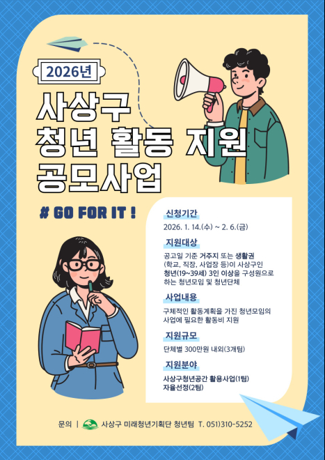 부산 사상구는 2026년 청년활동지원 공모사업에 참여할 청년 모임 및 단체를 모집한다고 13일 밝혔다.