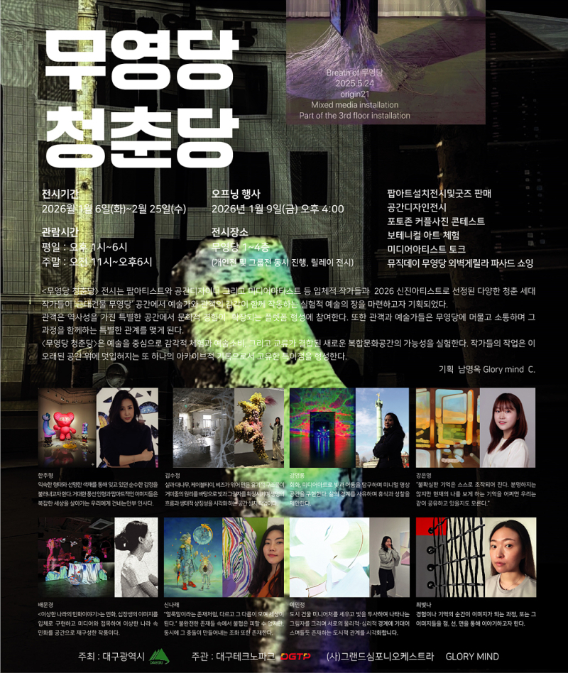 ‘무영당 청춘당’ 전시는 지역 문화예술인과 협업해 2026년 신진 아티스트로 선정된 청년 작가들이 무영당이라는 공간을 매개로 교류하는 실험적 예술의 장으로 기획됐다.